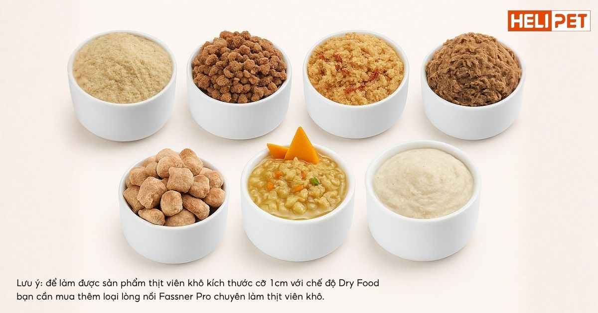 Lưu ý: để làm được sản phẩm thịt viên khô kích thước cỡ 1cm với chế độ Dry Food, bạn cần mua thêm loại lòng nồi Fassner Pro chuyên làm thịt viên khô.