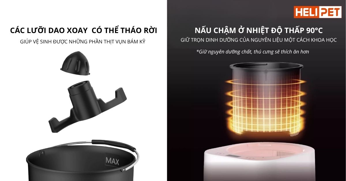 Tích hợp 6 chế độ thông minh, có thể tạo ra đến 6 loại món ăn khác nhau cho chó mèo (pate, súp, thịt khô, ruốc...).