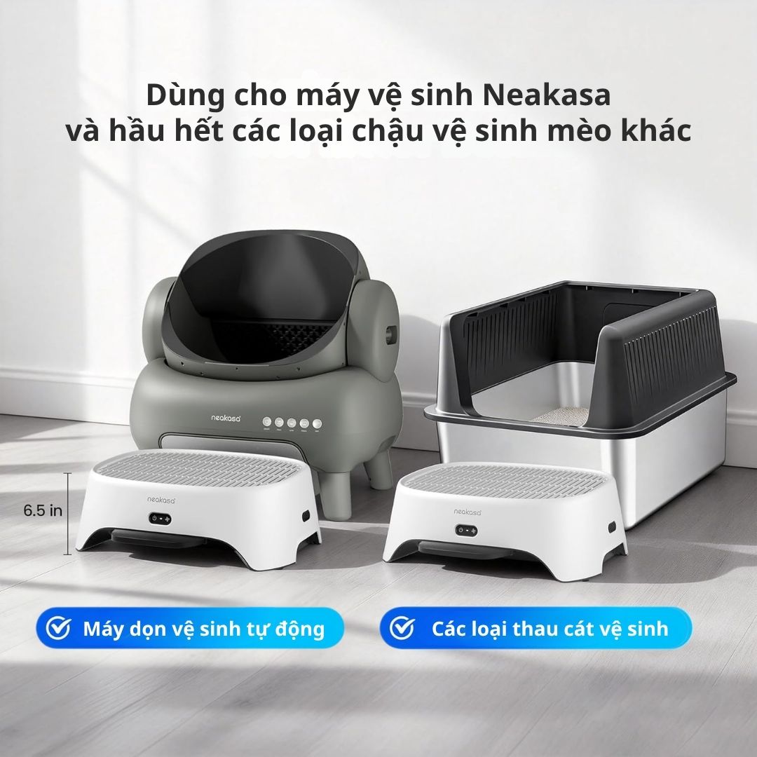 Với chiều cao lý tưởng 6.5 inch (khoảng 16.5cm), bậc thang khử mùi này đóng vai trò như một bước đệm hoàn hảo, hỗ trợ mèo cưng (đặc biệt là mèo con, mèo chân ngắn hoặc mèo lớn tuổi) ra vào khu vực vệ sinh dễ dàng hơn. Sản phẩm được thiết kế để kết hợp đồng bộ với máy dọn vệ sinh tự động Neakasa, đồng thời tương thích và dễ dàng sử dụng với hầu hết các loại thau, chậu cát truyền thống khác, biến không gian vệ sinh của thú cưng trở nên hiện đại và sạch sẽ toàn diện.