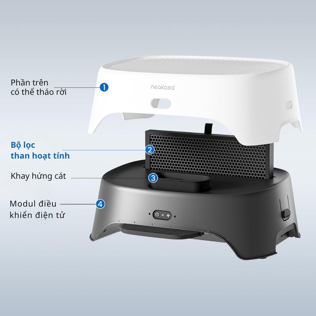 Bậc thang hứng cát kết hợp máy lọc không khí Neakasa sở hữu cấu trúc lắp ráp dạng module cực kỳ khoa học, bao gồm 4 bộ phận chính: Phần nắp lưới có thể tháo rời, Bộ lọc than hoạt tính khử mùi, Khay hứng cát ẩn và Module điều khiển điện tử dưới cùng. Thiết kế phân lớp rõ ràng này không chỉ giúp tối ưu hóa luồng khí hút - thổi mà còn giúp người dùng dễ dàng tháo rời từng phần để vệ sinh, thay lõi lọc hoặc đổ bỏ cát thừa chỉ trong vài thao tác đơn giản.