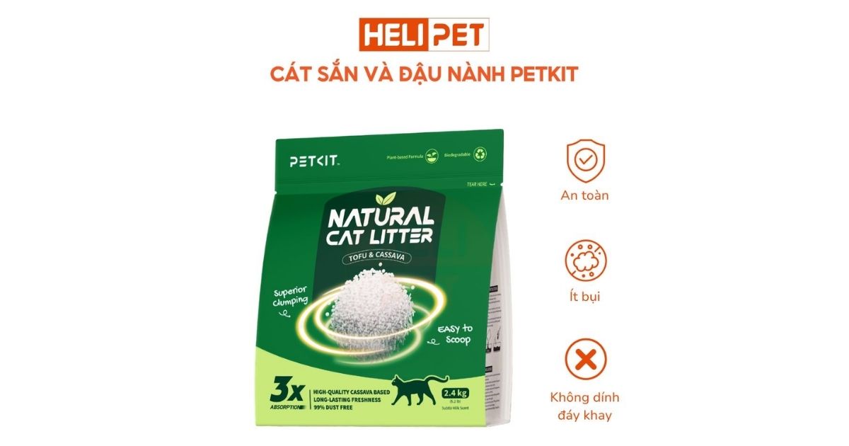 Nếu bạn tìm một loại cát vệ sinh sinh học khử mùi mạnh nhưng vẫn thân thiện môi trường, thì cát PETKIT sắn và đậu nành là lựa chọn đáng cân nhắc. Được làm từ bột đậu nành, tinh bột sắn tự nhiên và 2% baking soda, sản phẩm có khả năng khử mùi, hút ẩm nhanh, vón chắc, an toàn tuyệt đối cho mèo. Đặc biệt, cát có thể xả trực tiếp xuống toilet mà không gây tắc nghẽn – cực kỳ tiện cho căn hộ hoặc nhà nhỏ. Với hương thơm nhẹ nhàng, không hóa chất, đây là dòng cát lý tưởng cho người nuôi mèo nhạy cảm với mùi.