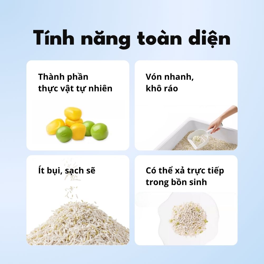 Cát được làm từ thành phần thực vật như đậu nành, sắn và baking soda – không bụi, vón nhanh, dễ dọn, có thể xả bồn cầu. Đây là loại cát vệ sinh cho mèo vừa tiện lợi, an toàn cho thú cưng, vừa thân thiện với môi trường.