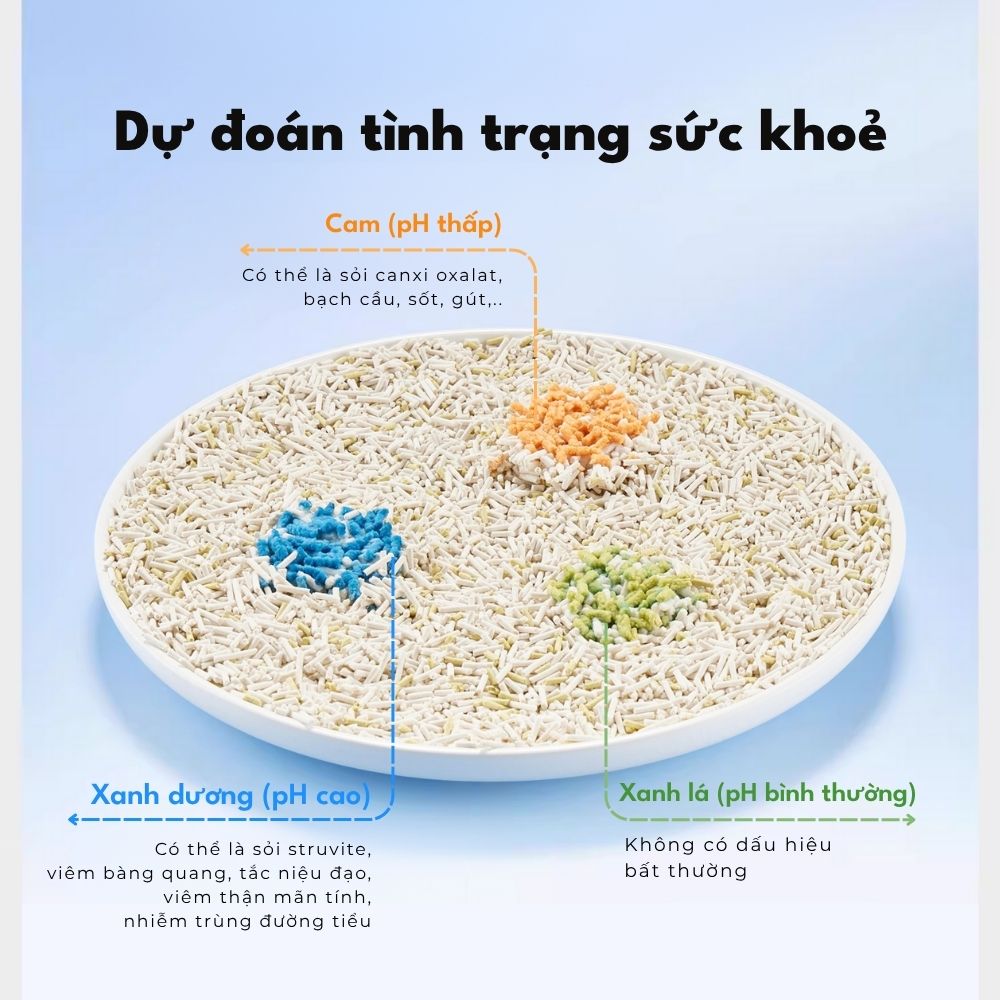 Cát vệ sinh cho mèo PETKIT giúp theo dõi nước tiểu là dòng cát mèo cao cấp tích hợp tính năng cát thử pH, giúp bạn theo dõi độ pH nước tiểu của mèo ngay tại nhà – hỗ trợ phát hiện sớm các vấn đề về đường tiết niệu như viêm hoặc sỏi bàng quang. Khi mèo đi vệ sinh, cát đổi màu chỉ sau 3 giây, dễ dàng quan sát bằng mắt thường.