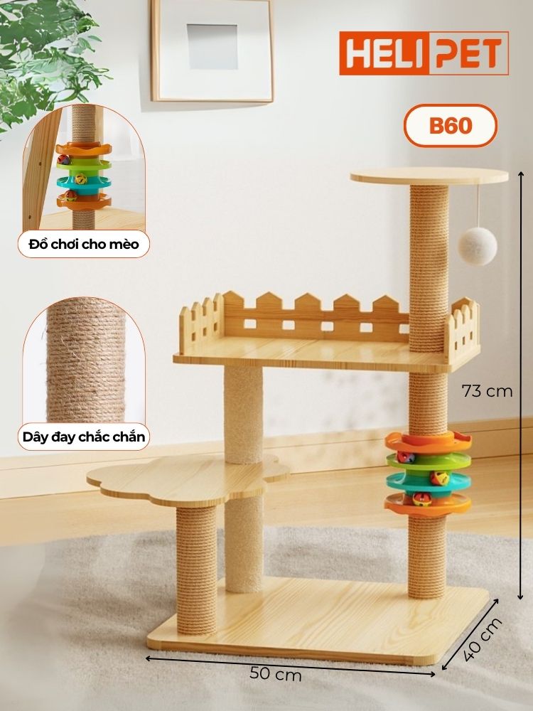 - Cattree cho mèo HELIPET B60 được chế tạo từ gỗ công nghiệp cao cấp với bề mặt mịn màng và vân gỗ tự nhiên bắt mắt. Phần khung chắc chắn giúp sản phẩm chịu lực tốt khi mèo leo trèo hay vận động mạnh.