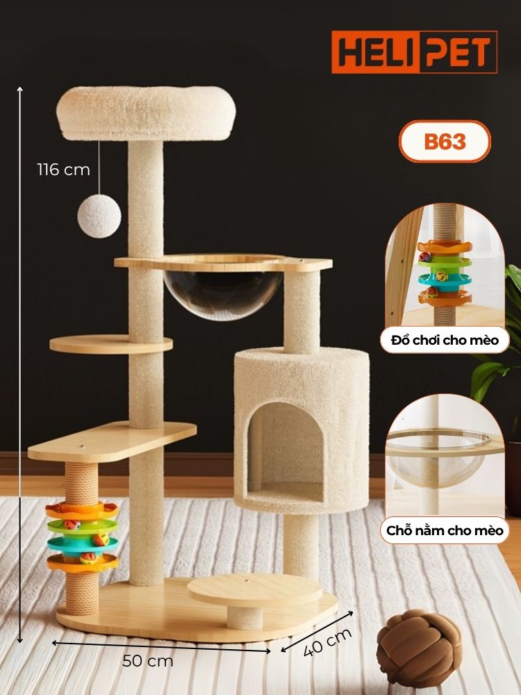 - Cattree cho mèo HELIPET B63 được chế tạo từ gỗ công nghiệp cao cấp với bề mặt mịn màng và vân gỗ tự nhiên bắt mắt. Phần khung chắc chắn giúp sản phẩm chịu lực tốt khi mèo leo trèo hay vận động mạnh.