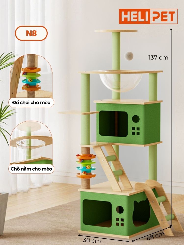 - Cattree cho mèo HELIPET N8 được chế tạo từ gỗ công nghiệp cao cấp với bề mặt mịn màng và vân gỗ tự nhiên bắt mắt. Phần khung chắc chắn giúp sản phẩm chịu lực tốt khi mèo leo trèo hay vận động mạnh.