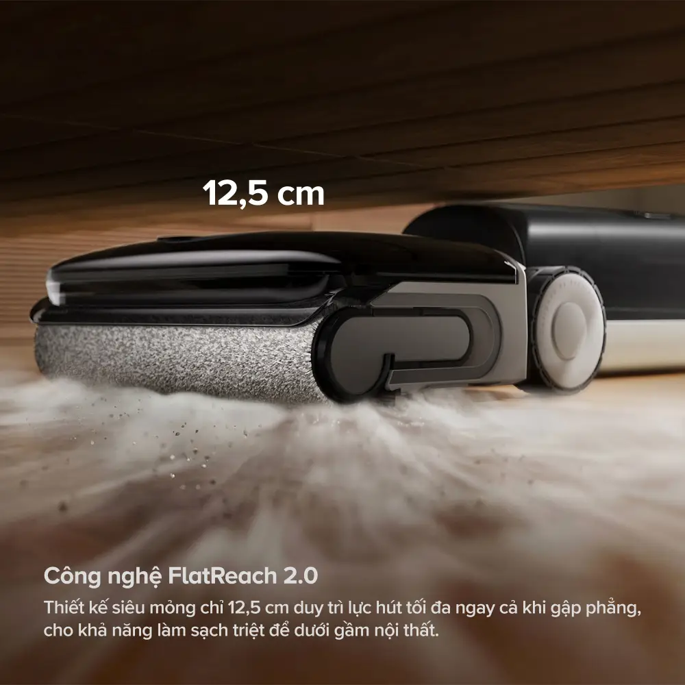 FlatReach 2.0 – Chinh phục gầm thấp toàn diệnSự linh hoạt của Roborock F25 RT Gen 2 được thể hiện rõ nét qua thiết kế siêu mỏng FlatReach 2.0 chỉ 12.5cm. Cải tiến này cho phép bạn gập phẳng hoàn toàn thân máy để tiếp cận sâu bên dưới gầm giường hay tủ kệ mà vẫn duy trì được lưu lượng gió và lực hút tối đa, giúp giải quyết triệt để các khu vực vốn là nỗi ám ảnh của việc dọn dẹp thủ công. |