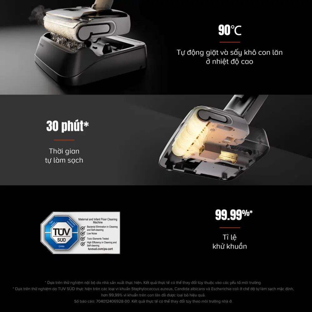 Hệ thống giặt con lăn nước nóng 90°C tiệt trùngRoborock F25 RT loại bỏ hoàn toàn nỗi lo về vi khuẩn và mùi hôi nhờ tính năng tự động giặt con lăn bằng nước nóng ở nhiệt độ kỷ lục 90°C. Quy trình này không chỉ đánh tan dầu mỡ bám dính mà còn tiệt trùng phụ kiện một cách toàn diện, kết hợp với chế độ sấy khô nhanh trong 30 phút giúp con lăn luôn trong trạng thái sạch sẽ và khô ráo cho lần sử dụng tiếp theo. |