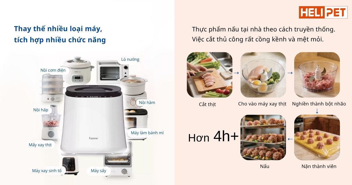 Máy Fassner Mini có thể thay thế cho nhiều dụng cụ bếp truyền thống (như nồi hấp, máy xay, chảo nấu hay lò sấy,...) mà sản phẩm làm ra cũng vô cùng hợp khẩu vị chó mèo. Từ nay, việc chuẩn bị thức ăn cho chó mèo không còn tốn nhiều thời gian và công đoạn rườm rà, mà trở nên nhanh chóng, tiện lợi và khoa học hơn bao giờ hết.