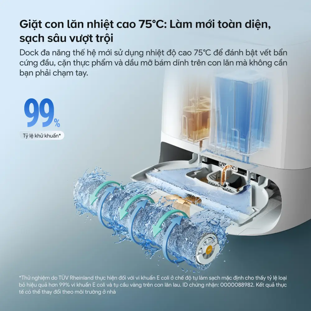 - Dock sạc cải tiến thế hệ mới: Sỡ hữu nhiều tính năng vượt trội như tự động đổ bụi, giặt giẻ lau bằng nước nóng 75°C, sấy giẻ lau 55°C.